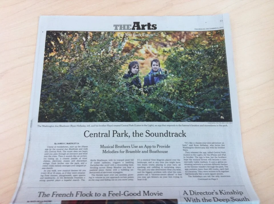 The Holladay Brothers are renowned for their location-aware composition: music created and mapped to a physical space, released exclusively as an app experience, using a mobile device’s GPS to dynamically alter the music as the listener traverses a landscape. Their first production in 2011, “The National Mall” mapped to the park in Washington, DC, was described by the Washington Post as “magical… like using GPS to navigate a dream” and was included in their list of the year’s top albums (a first for an app).